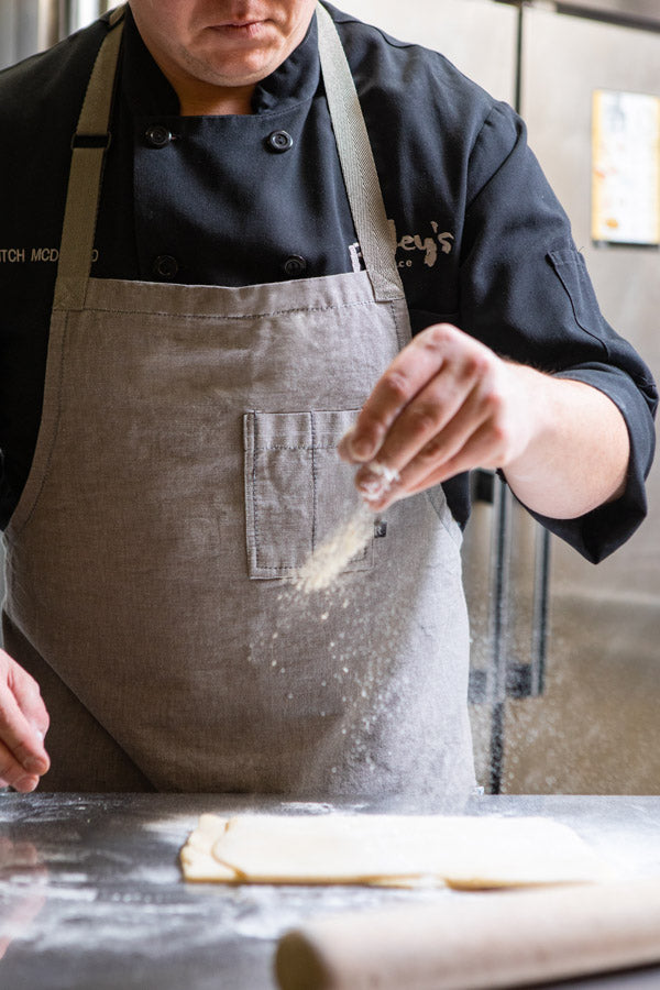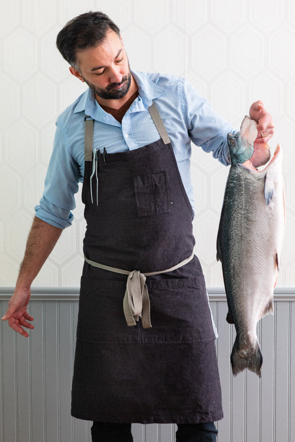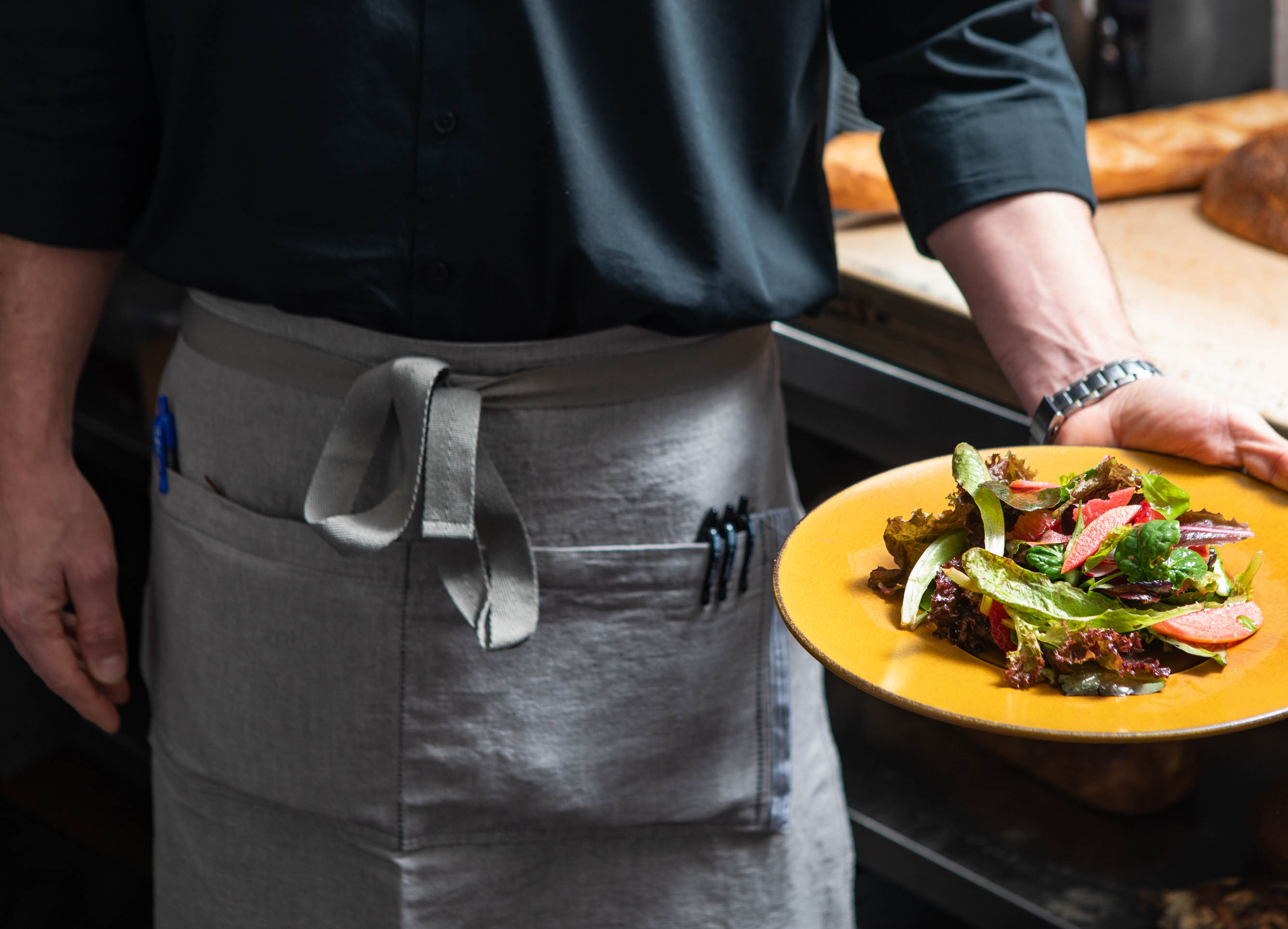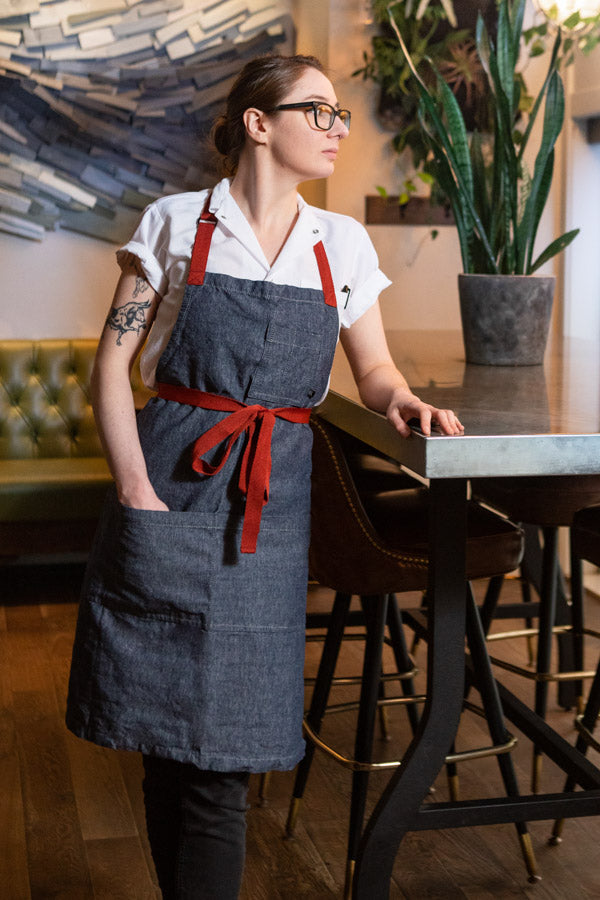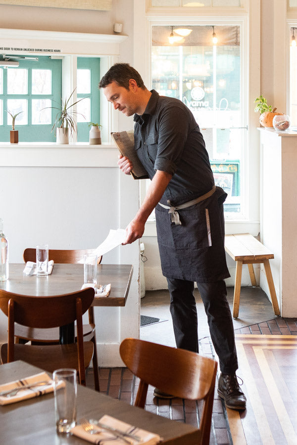 We are using the classic aprons in the kitchen and love them so much. Can’t ask for more from an apron! Quality, comfort, style, hang them to dry and no ironing necessary. We’ve had FoH staff wearing them as well but they proved to be a little too much apron for that, and so we just got this ‘bistro’ style, and everyone is extremely happy…upon trying it on, one server was quite jubilant, loudly proclaiming it to her favorite apron ever.